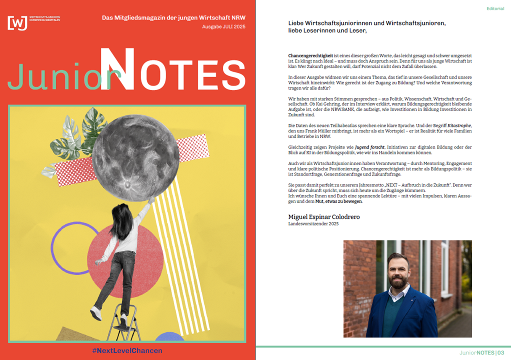 Bildungsgerechtigkeit ist Zukunftsgerechtigkeit. Die neue JuniorNOTES-Ausgabe der Wirtschaftsjunioren NRW zeigt, was es braucht, damit kein Talent verloren geht – mit starken Stimmen, klaren Positionen und echten Perspektiven.
