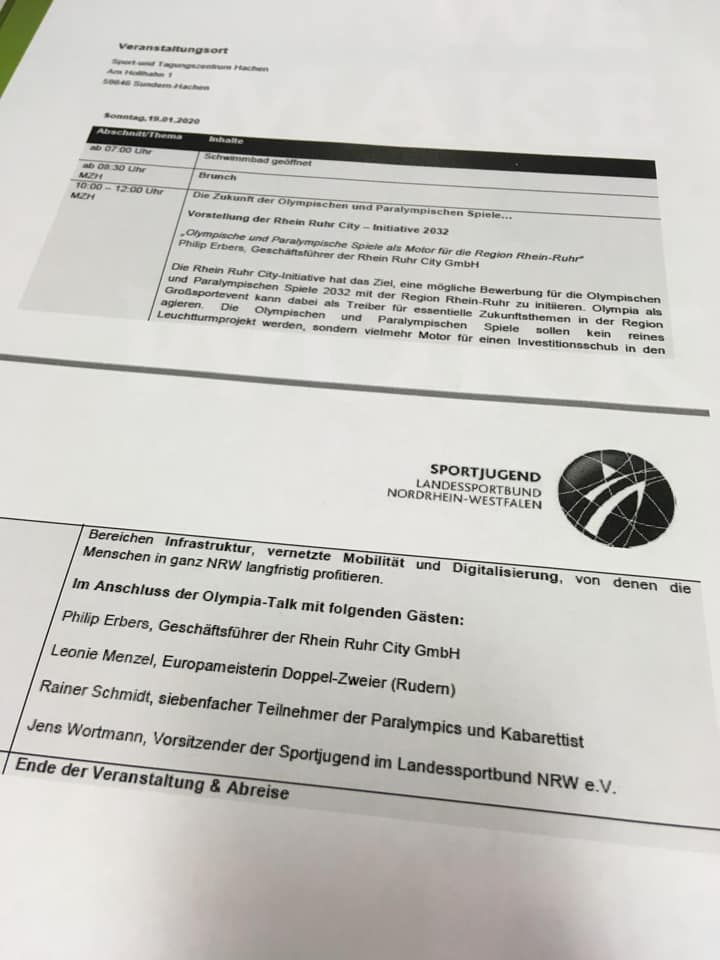 Am 19. Januar sind der Landesvorsitzende Thomas Müller sowie Anja Bräuning, verantwortliche für das Landesressort „Bildung & Wirtschaft“, der Gegeneinladung von Jens Wortmann, Landessportbund Nordrhein-Westfalen e.V., gefolgt und durften bei der Vorstellung der Rhein-Ruhr-City Initiative 2032 und dem Olympia-Talk im sauerländischen Sundern bei der Jahrestagung der Sportjugend beisitzen.