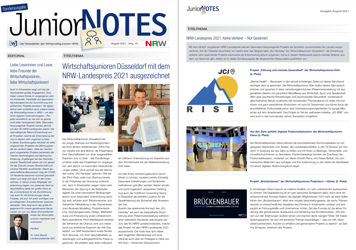 Auch in Krisenzeiten zeigt sich bei der Vereinsarbeit großes Engagement. Dieses haben unsere Kreise im vergangenen Jahr mit Kreativität, Felxibilität und besonderer Hartnäckigkeit bei der Durchführung ihrer zahlreichen Projekte bewiesen. Ob digital, hybrid oder schließlich auch präsent haben die Wirtschaftsjunioren in NRW – mit dem ihnen eigenen Unternehmergeist – Projekte verwirklicht, an die sich so gewiss nicht jeder herangetraut hätte. Besonders herausragende Projekte werden jährlich mit dem WJ NRW Landespreis geehrt. Die überwältigende Rekord-Einreichung von elf Projekten machte die Entscheidung der Jury in diesem Jahr ungemein schwer.