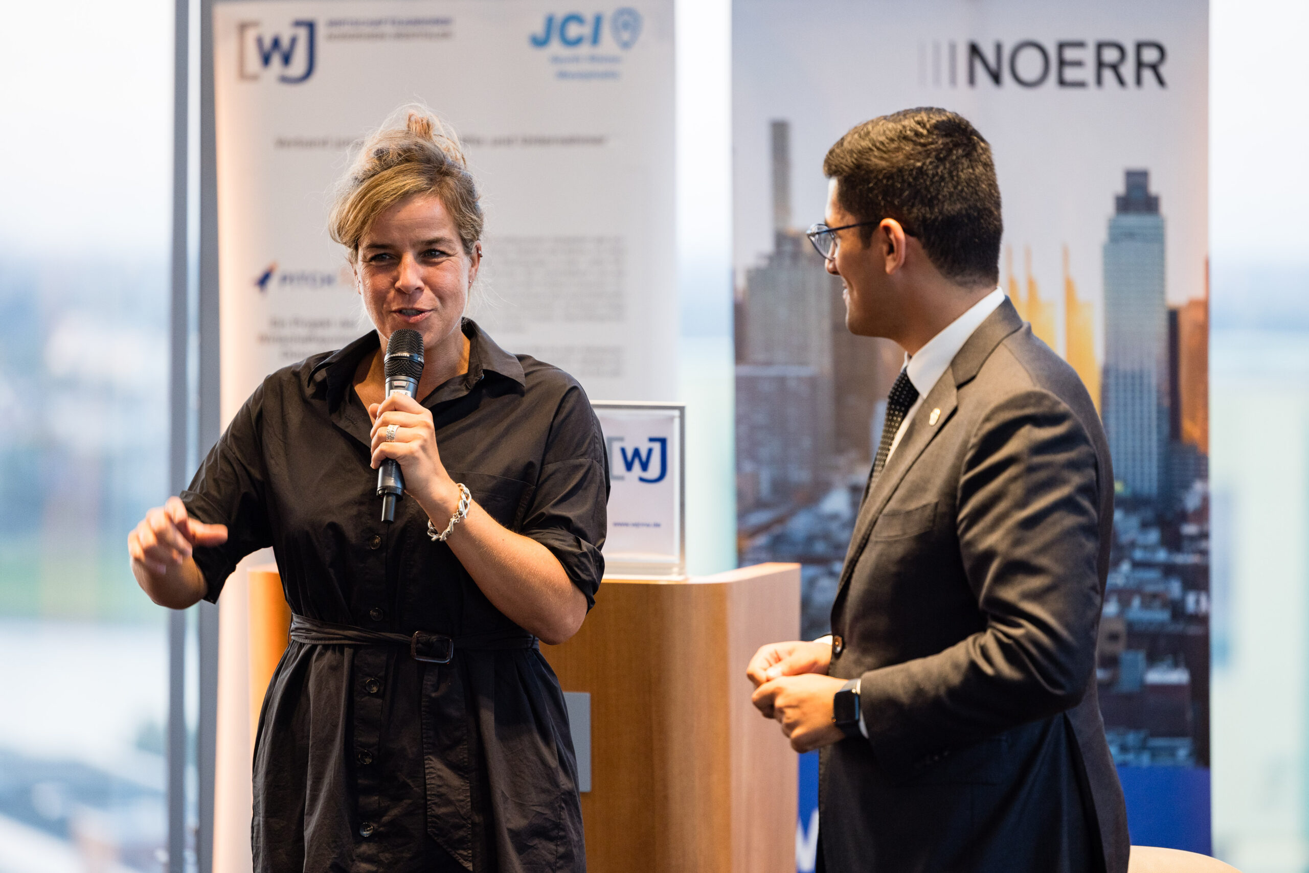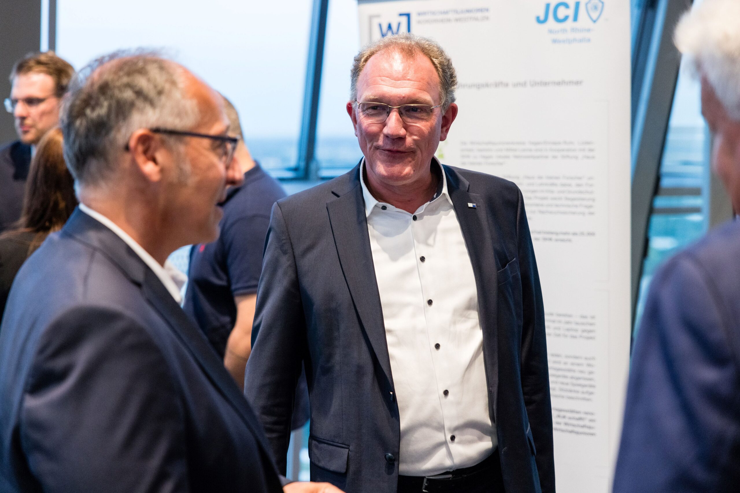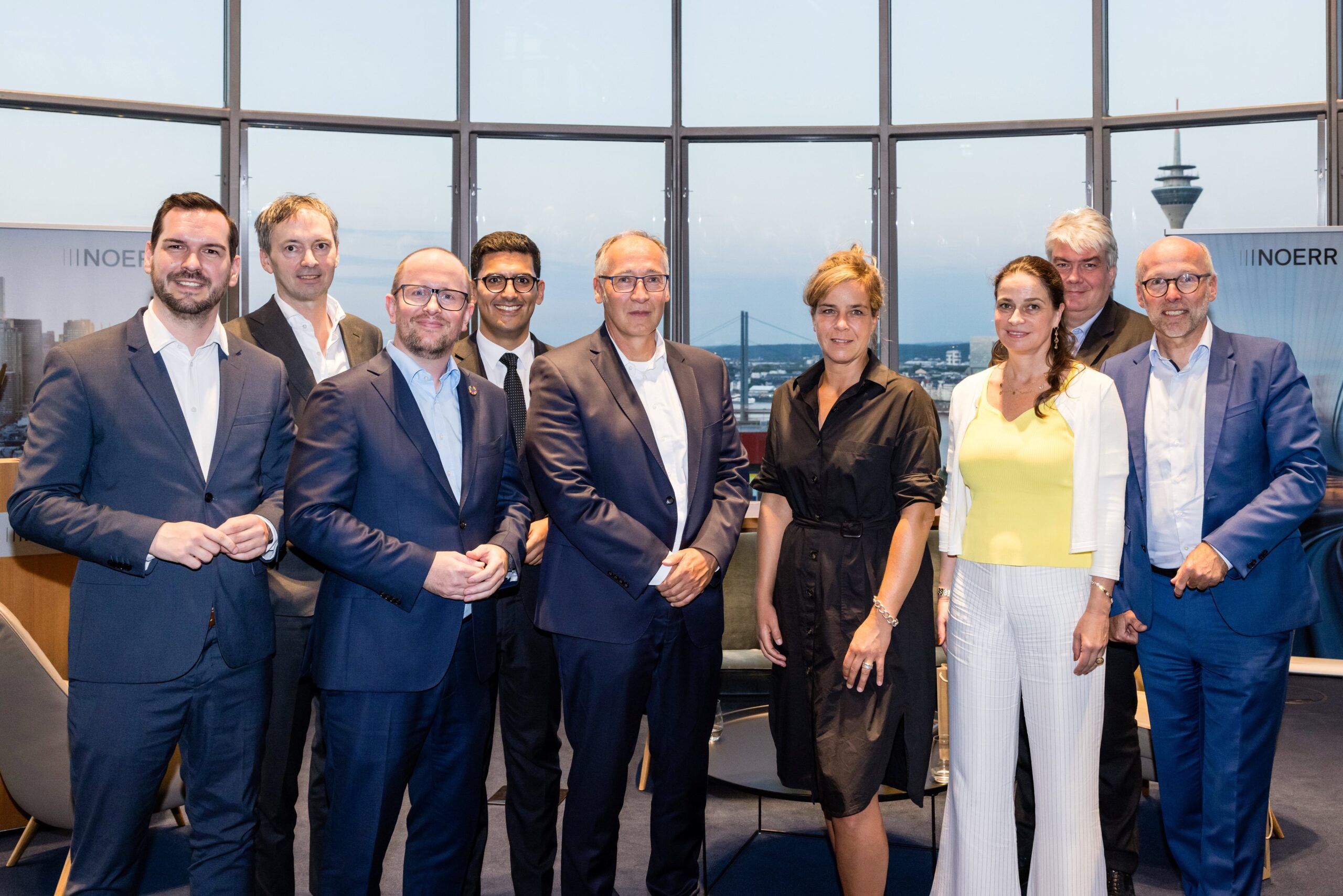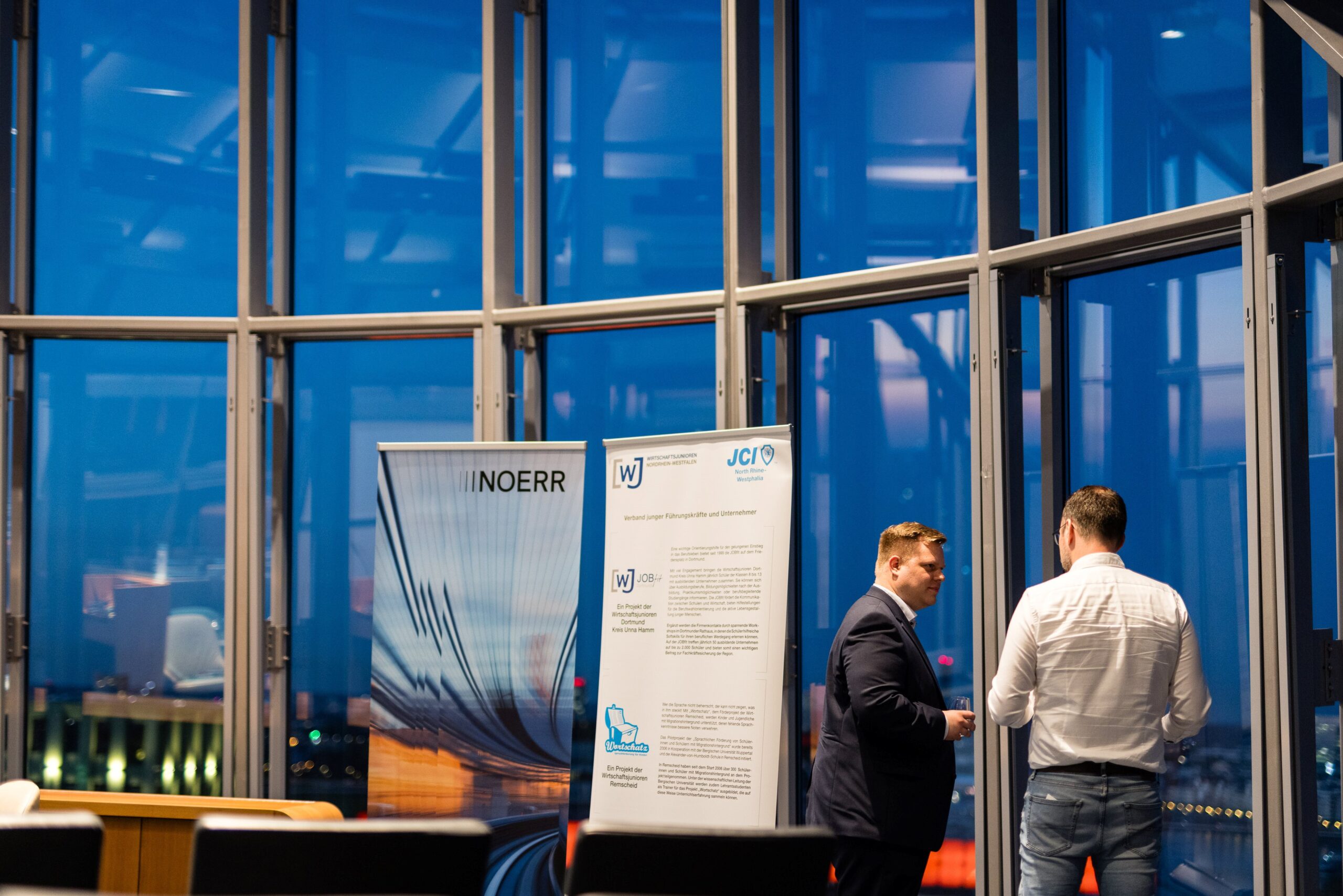 Am Abend bot das „Skydeck“ der Kanzlei Noerr LLP über den Dächern des Düsseldorfer Medienhafens auch in diesem Jahr wieder eine eindrucksvolle Kulisse für den 5. Parlamentarischen Abend. Rund 120 Wirtschaftsjuniorinnen, Landtagsabgeordnete und weitere geladene Gäste lauschten der Keynote von Roland Schüßler. Als Vorsitzender der Geschäftsführung der NRW-Regionaldirektion der Bundesagentur für Arbeit lieferte Schüßler beunruhigende Zahlen und Fakten der aktuellen und zu erwartenden Entwicklung des uns alle betreffenden Mangels an Fach- und Arbeitskräften. In der anschließenden Podiumsdiskussion diskutierte er unter der Moderation von Hicham El Founti mit weiteren Gästen und dem Publikum verschiedene Lösungsansätze zur Bewältigung dieser enormen Aufgabe. Hicham El Founti begrüßte als projektverantwortliches Landesvorstandsmitglied Prof. Dr.-Ing. Katja Windt, Mitglied der Geschäftsführung bei der SMS-Group Düsseldorf und Klaus Bourdick, fachpolitischer Sprecher für Bildung und Fachkräfte der IHKs in NRW, auf dem Podium. Mona Neubaur, welche als stellvertretende Ministerpräsidentin und Ministerin für Wirtschaft, Industrie, Klimaschutz und Energie den Parlamentarischen Abend ebenfalls mit ihrem Besuch beehrte, rief die jungen Unternehmer/innen und Führungskräfte in ihrem Schlusswort auf, dem Problem unter anderem mit fairen Arbeitsbedingungen für ihre Mitarbeitenden entgegenzuwirken.