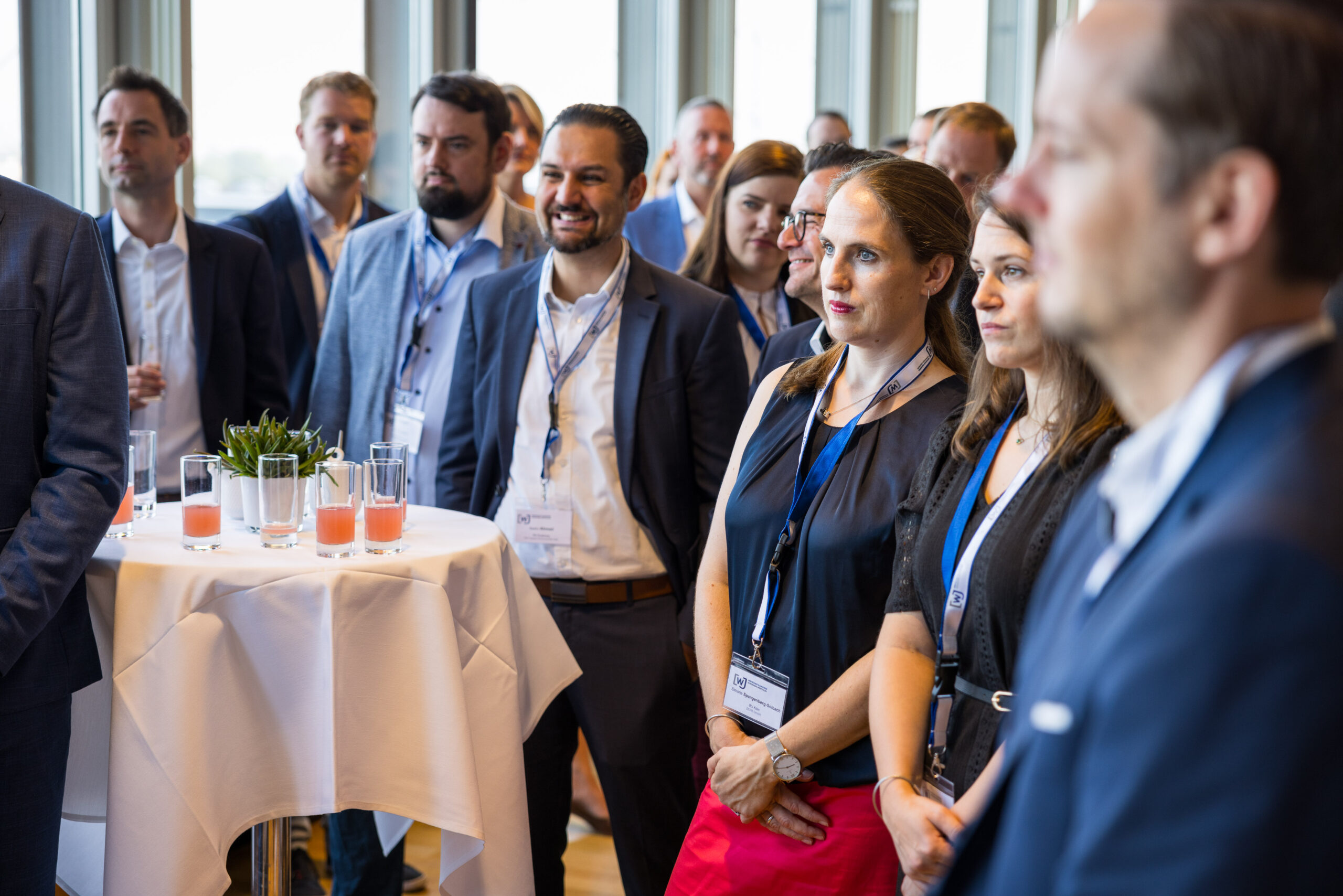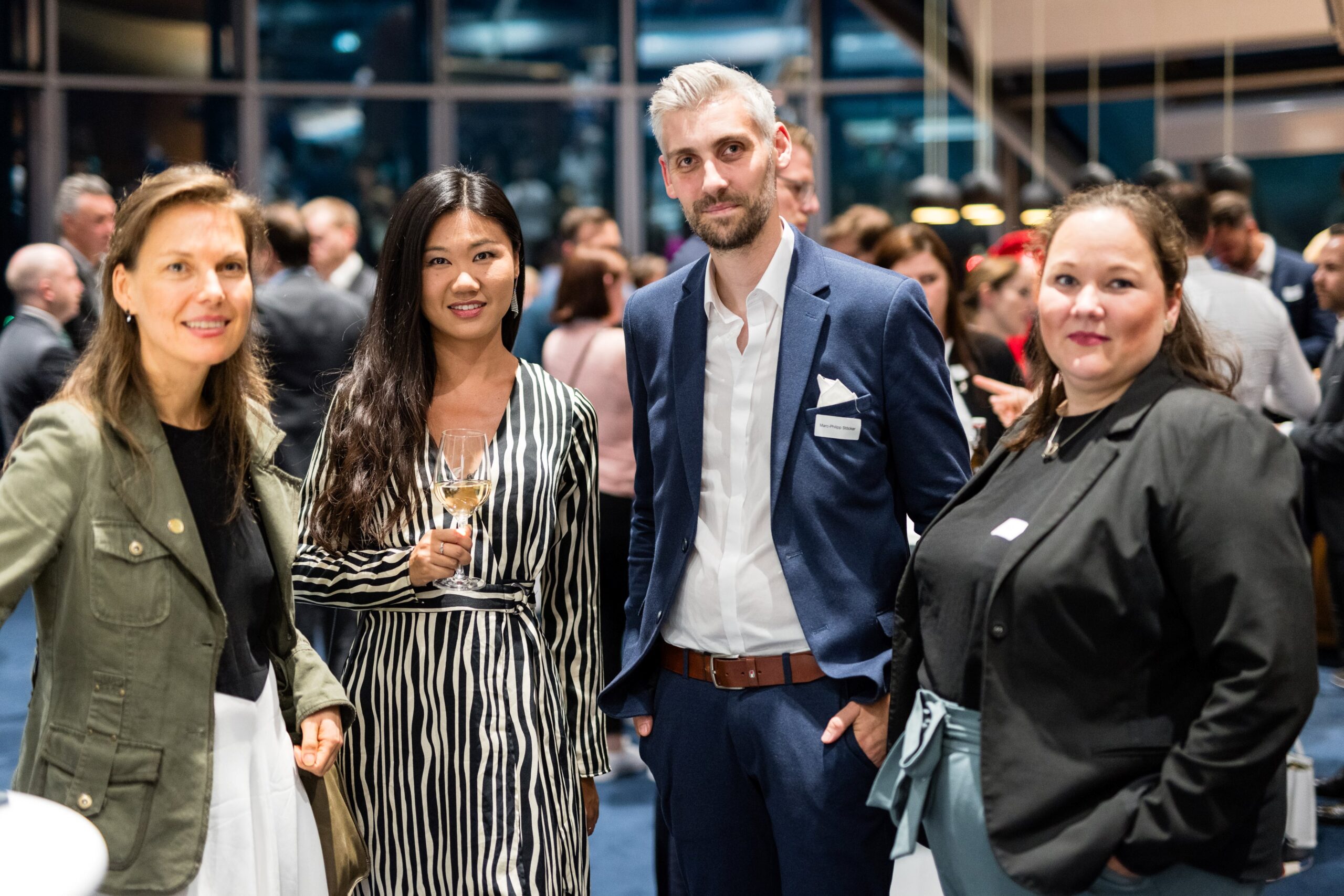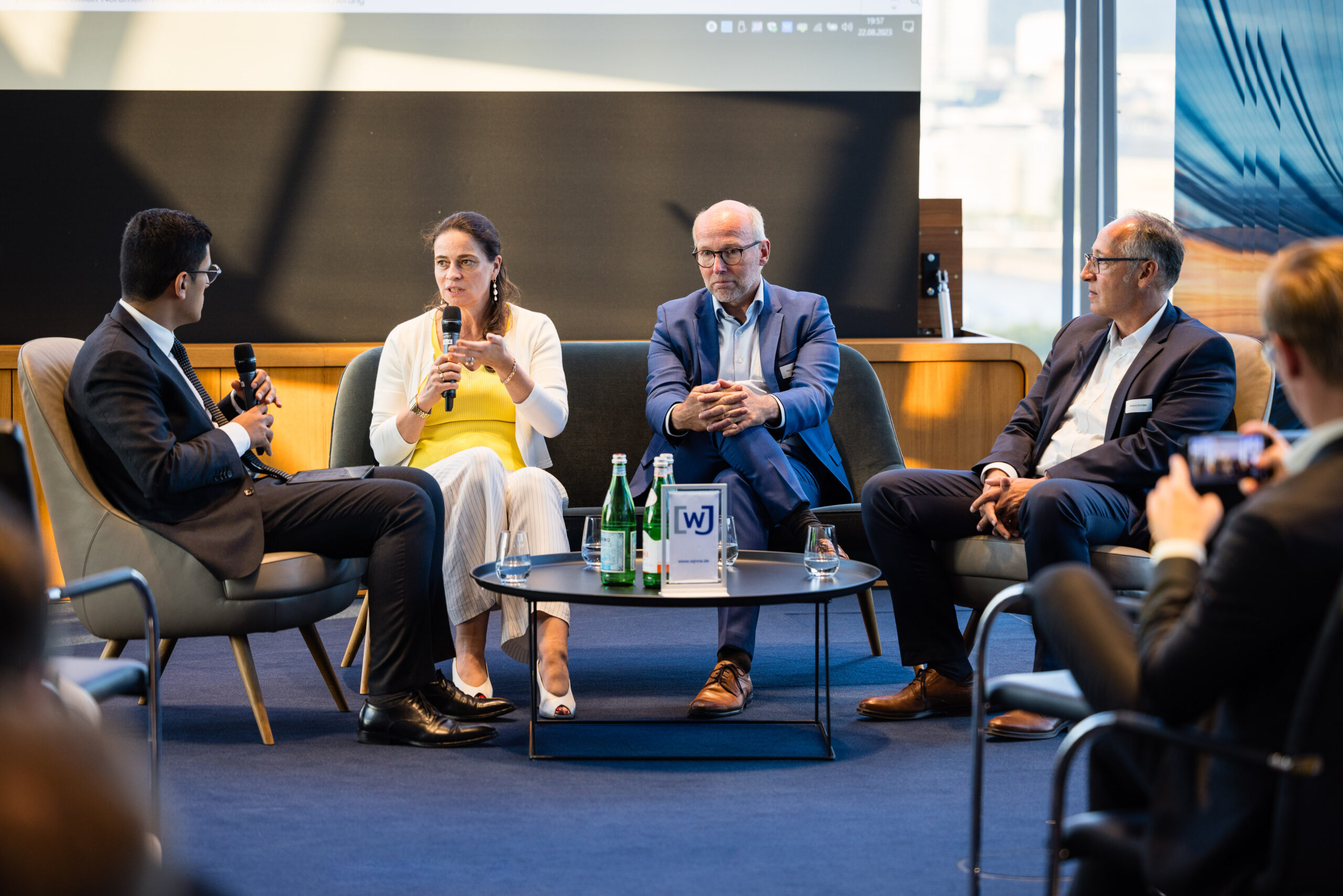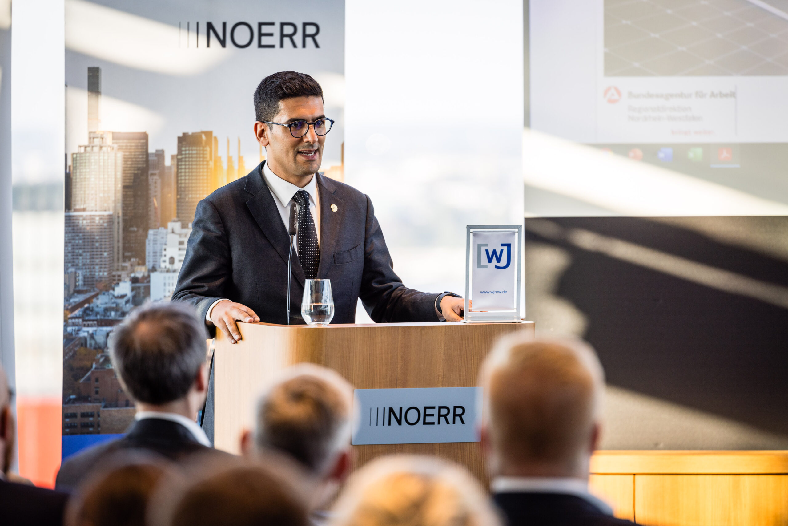 Am Abend bot das „Skydeck“ der Kanzlei Noerr LLP über den Dächern des Düsseldorfer Medienhafens auch in diesem Jahr wieder eine eindrucksvolle Kulisse für den 5. Parlamentarischen Abend. Rund 120 Wirtschaftsjuniorinnen, Landtagsabgeordnete und weitere geladene Gäste lauschten der Keynote von Roland Schüßler. Als Vorsitzender der Geschäftsführung der NRW-Regionaldirektion der Bundesagentur für Arbeit lieferte Schüßler beunruhigende Zahlen und Fakten der aktuellen und zu erwartenden Entwicklung des uns alle betreffenden Mangels an Fach- und Arbeitskräften. In der anschließenden Podiumsdiskussion diskutierte er unter der Moderation von Hicham El Founti mit weiteren Gästen und dem Publikum verschiedene Lösungsansätze zur Bewältigung dieser enormen Aufgabe. Hicham El Founti begrüßte als projektverantwortliches Landesvorstandsmitglied Prof. Dr.-Ing. Katja Windt, Mitglied der Geschäftsführung bei der SMS-Group Düsseldorf und Klaus Bourdick, fachpolitischer Sprecher für Bildung und Fachkräfte der IHKs in NRW, auf dem Podium. Mona Neubaur, welche als stellvertretende Ministerpräsidentin und Ministerin für Wirtschaft, Industrie, Klimaschutz und Energie den Parlamentarischen Abend ebenfalls mit ihrem Besuch beehrte, rief die jungen Unternehmer/innen und Führungskräfte in ihrem Schlusswort auf, dem Problem unter anderem mit fairen Arbeitsbedingungen für ihre Mitarbeitenden entgegenzuwirken.