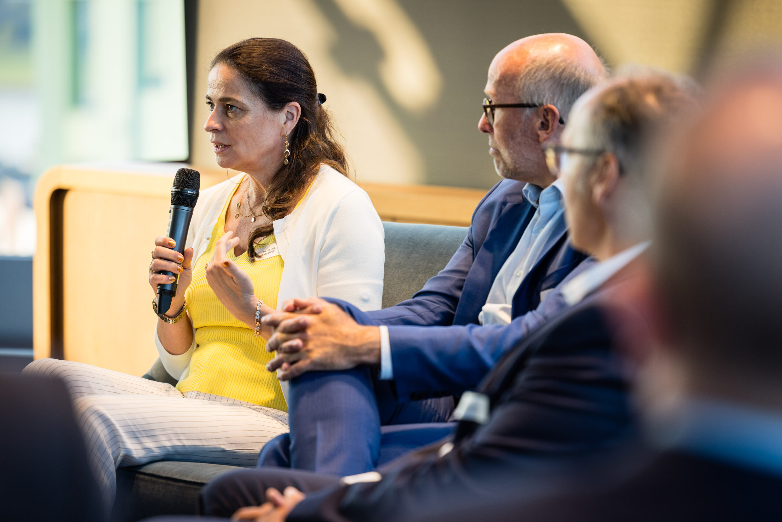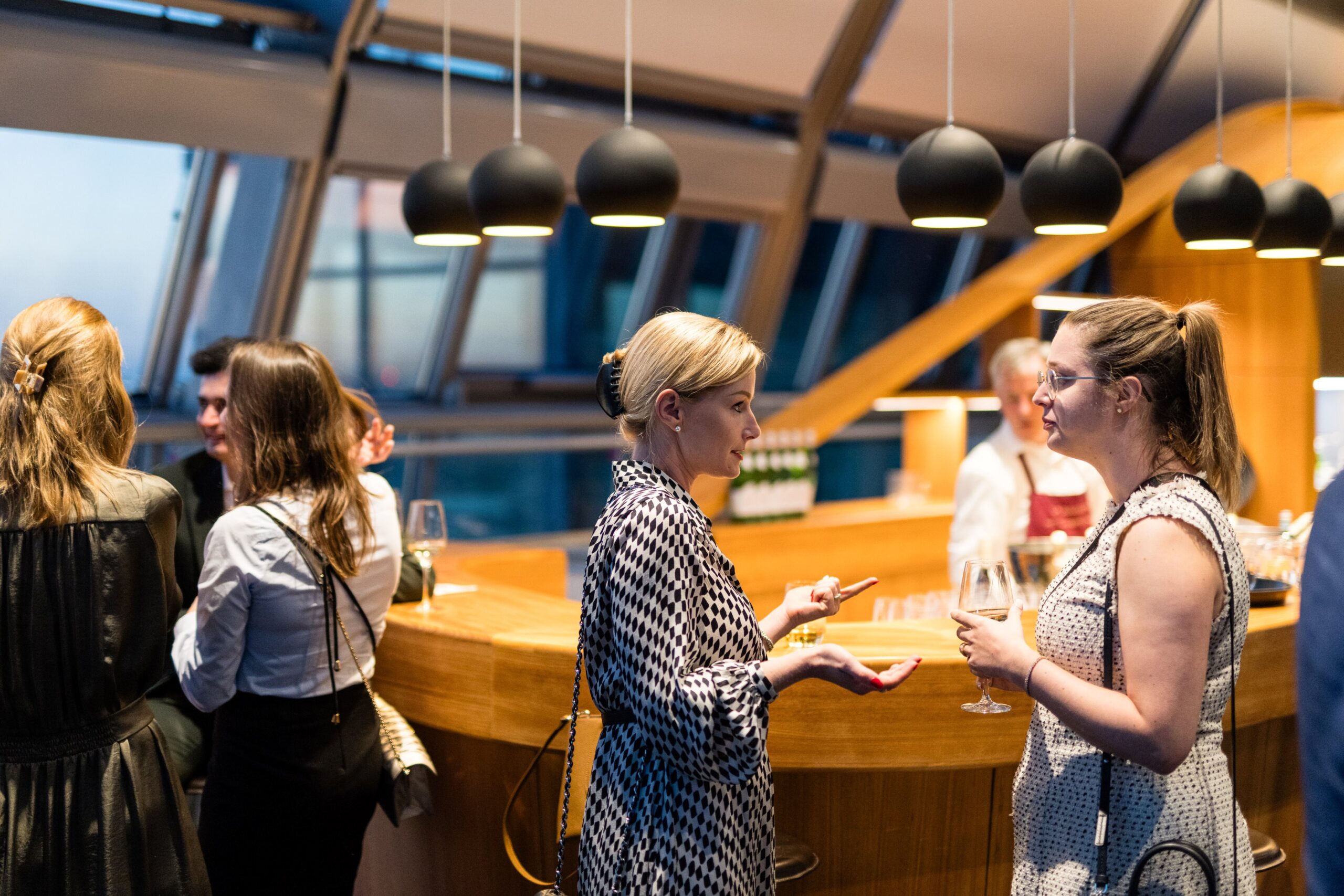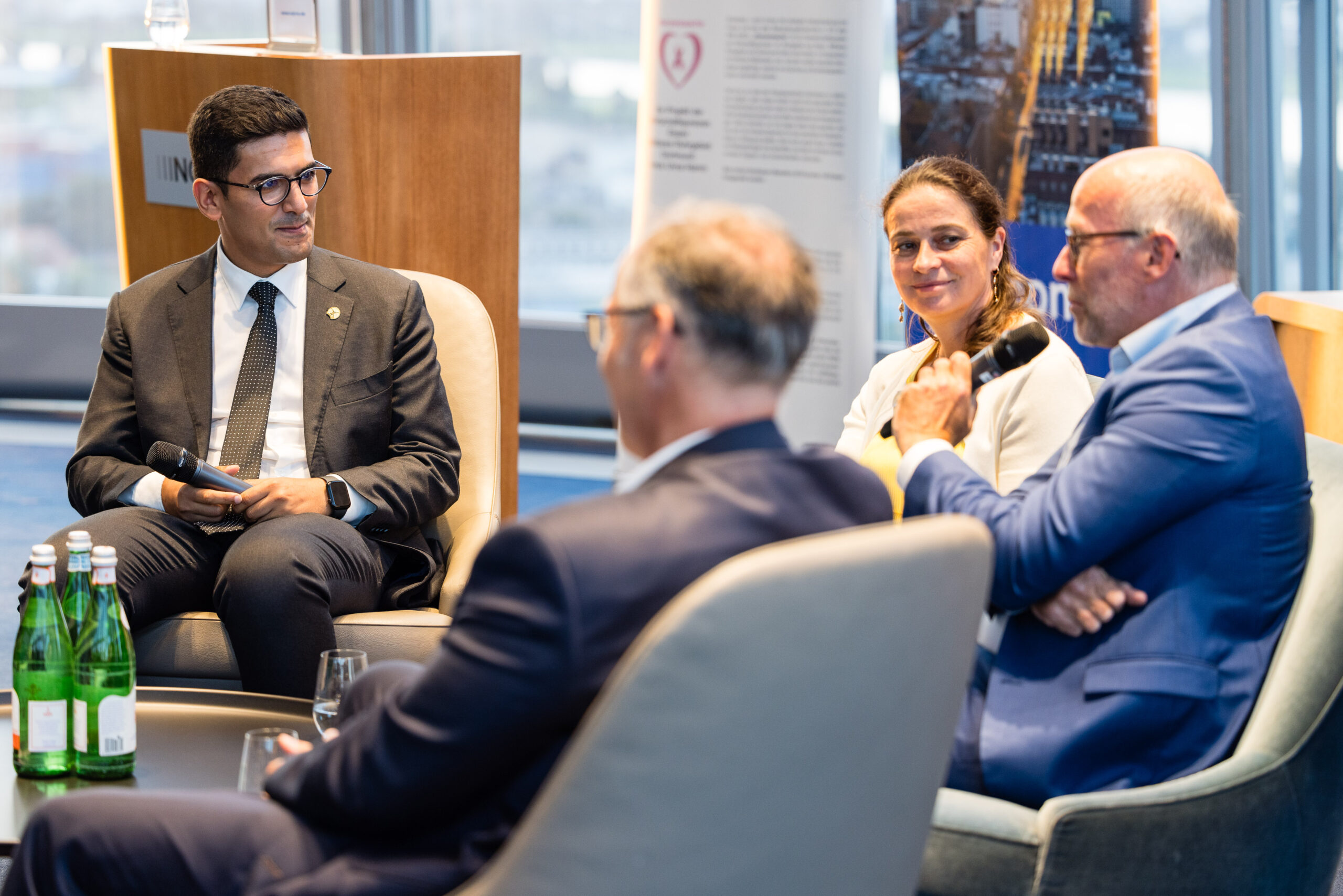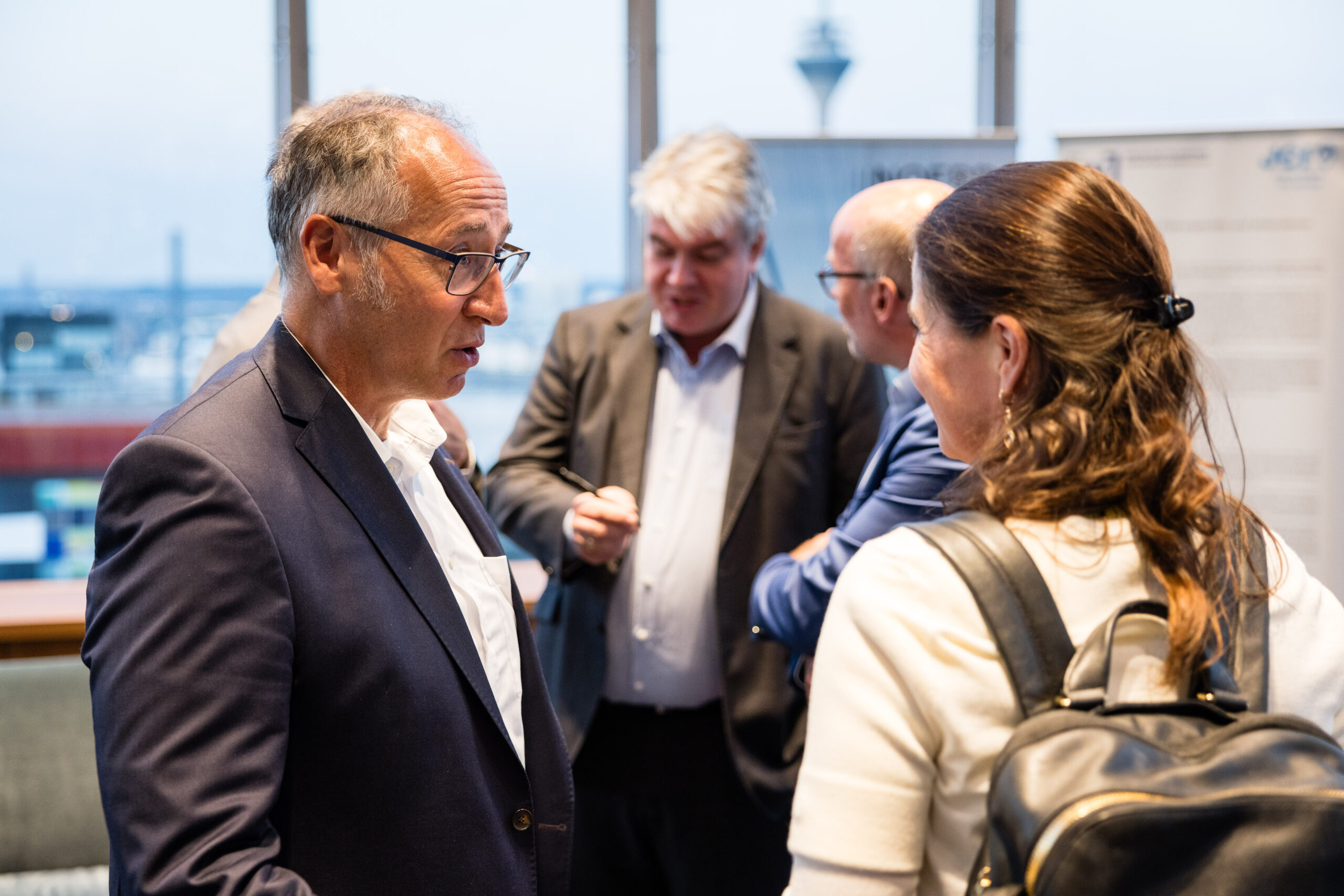 Am Abend bot das „Skydeck“ der Kanzlei Noerr LLP über den Dächern des Düsseldorfer Medienhafens auch in diesem Jahr wieder eine eindrucksvolle Kulisse für den 5. Parlamentarischen Abend. Rund 120 Wirtschaftsjuniorinnen, Landtagsabgeordnete und weitere geladene Gäste lauschten der Keynote von Roland Schüßler. Als Vorsitzender der Geschäftsführung der NRW-Regionaldirektion der Bundesagentur für Arbeit lieferte Schüßler beunruhigende Zahlen und Fakten der aktuellen und zu erwartenden Entwicklung des uns alle betreffenden Mangels an Fach- und Arbeitskräften. In der anschließenden Podiumsdiskussion diskutierte er unter der Moderation von Hicham El Founti mit weiteren Gästen und dem Publikum verschiedene Lösungsansätze zur Bewältigung dieser enormen Aufgabe. Hicham El Founti begrüßte als projektverantwortliches Landesvorstandsmitglied Prof. Dr.-Ing. Katja Windt, Mitglied der Geschäftsführung bei der SMS-Group Düsseldorf und Klaus Bourdick, fachpolitischer Sprecher für Bildung und Fachkräfte der IHKs in NRW, auf dem Podium. Mona Neubaur, welche als stellvertretende Ministerpräsidentin und Ministerin für Wirtschaft, Industrie, Klimaschutz und Energie den Parlamentarischen Abend ebenfalls mit ihrem Besuch beehrte, rief die jungen Unternehmer/innen und Führungskräfte in ihrem Schlusswort auf, dem Problem unter anderem mit fairen Arbeitsbedingungen für ihre Mitarbeitenden entgegenzuwirken.