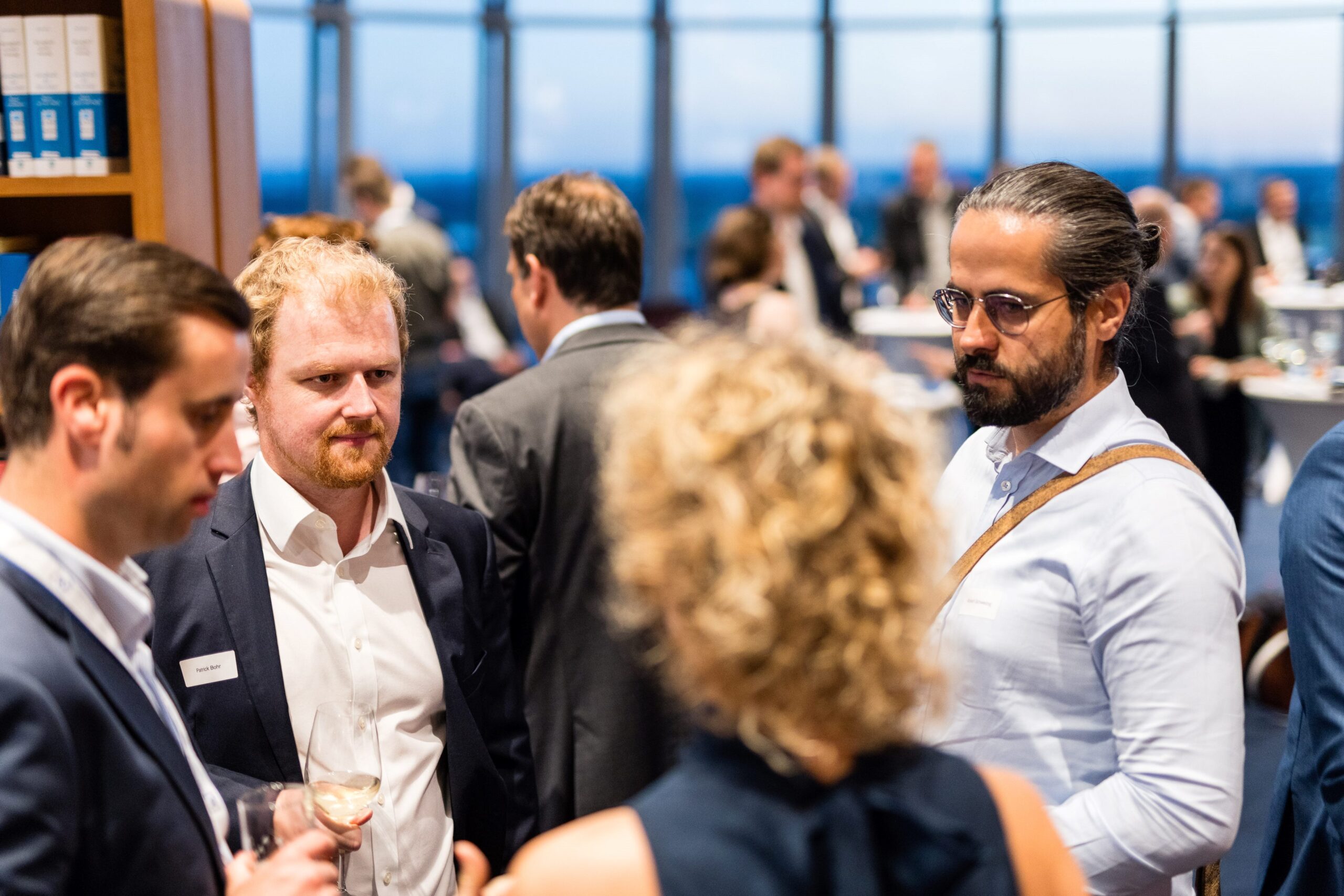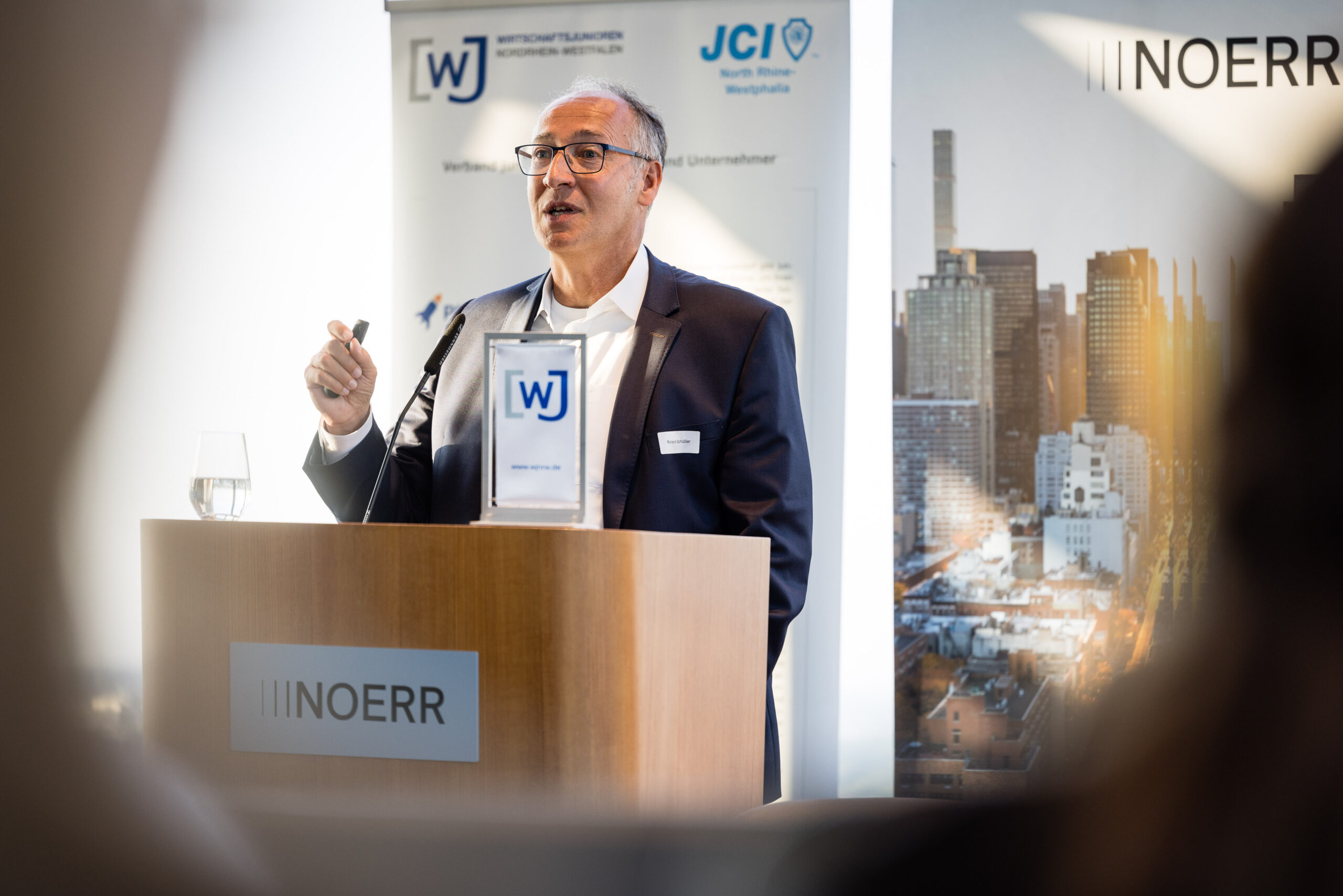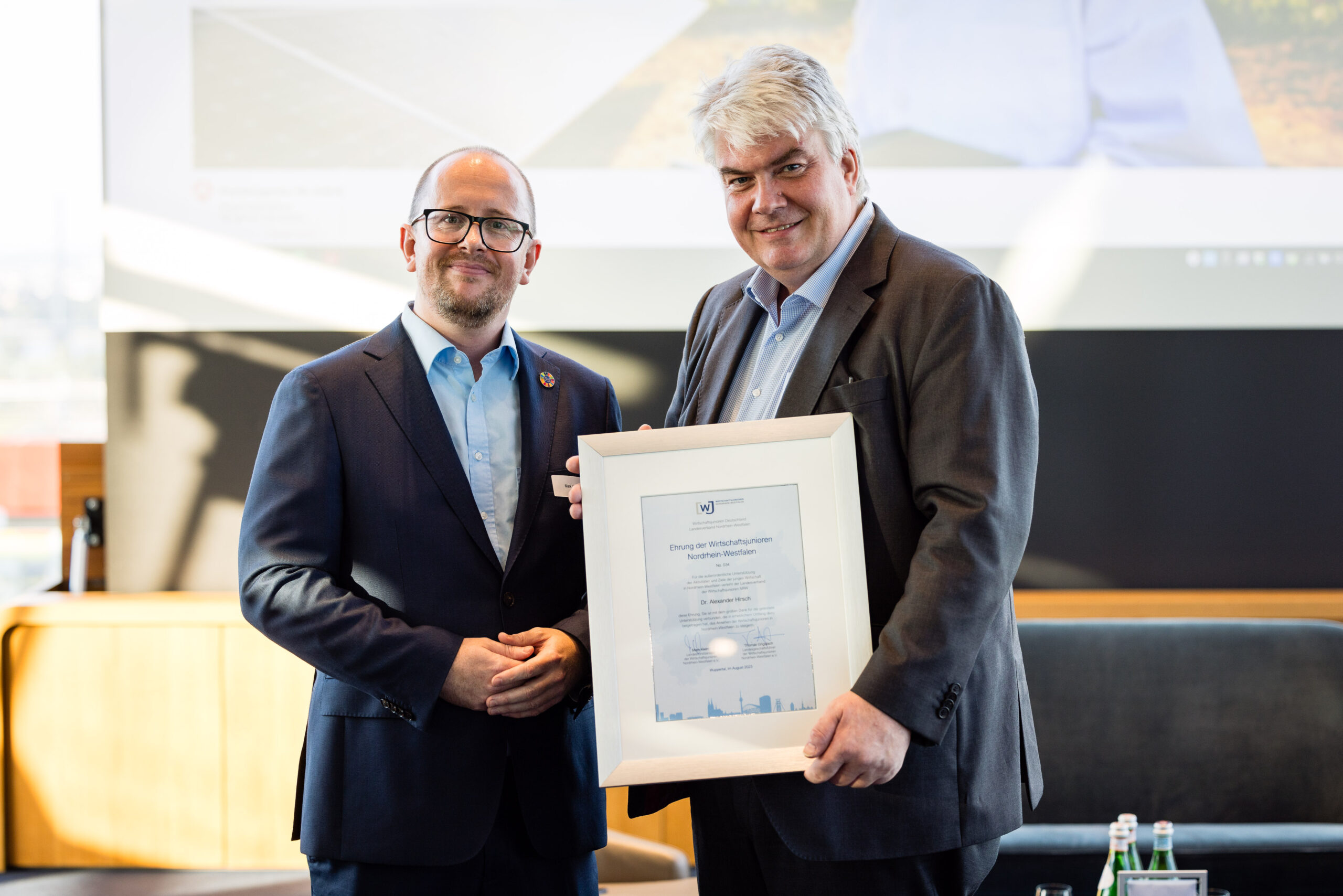 Im Anschluss an die spannende Diskussion wurden die Thematik und die Eindrücke des ersten KHT-Tages bei einem Get-together vertieft und natürlich blieb auch Zeit für den ungezwungenen Austausch zwischen junger Wirtschaft und Landespolitik. Ein besonderer Dank gilt hier auch wieder der Kanzlei Noerr LLP und insbesondere Herrn Dr. Alexander Hirsch, welcher den Parlamentarischen Abend seit dem ersten Tag durch die vertrauensvolle Bereitstellung der Räumlichkeiten unterstützt: Mark Klein überreichte dem sichtlich überraschten Dr. Hirsch die Landesehrung der Wirtschaftsjunioren NRW für die außerordentliche Unterstützung der Aktivitäten des WJNRW Landesverbandes.
