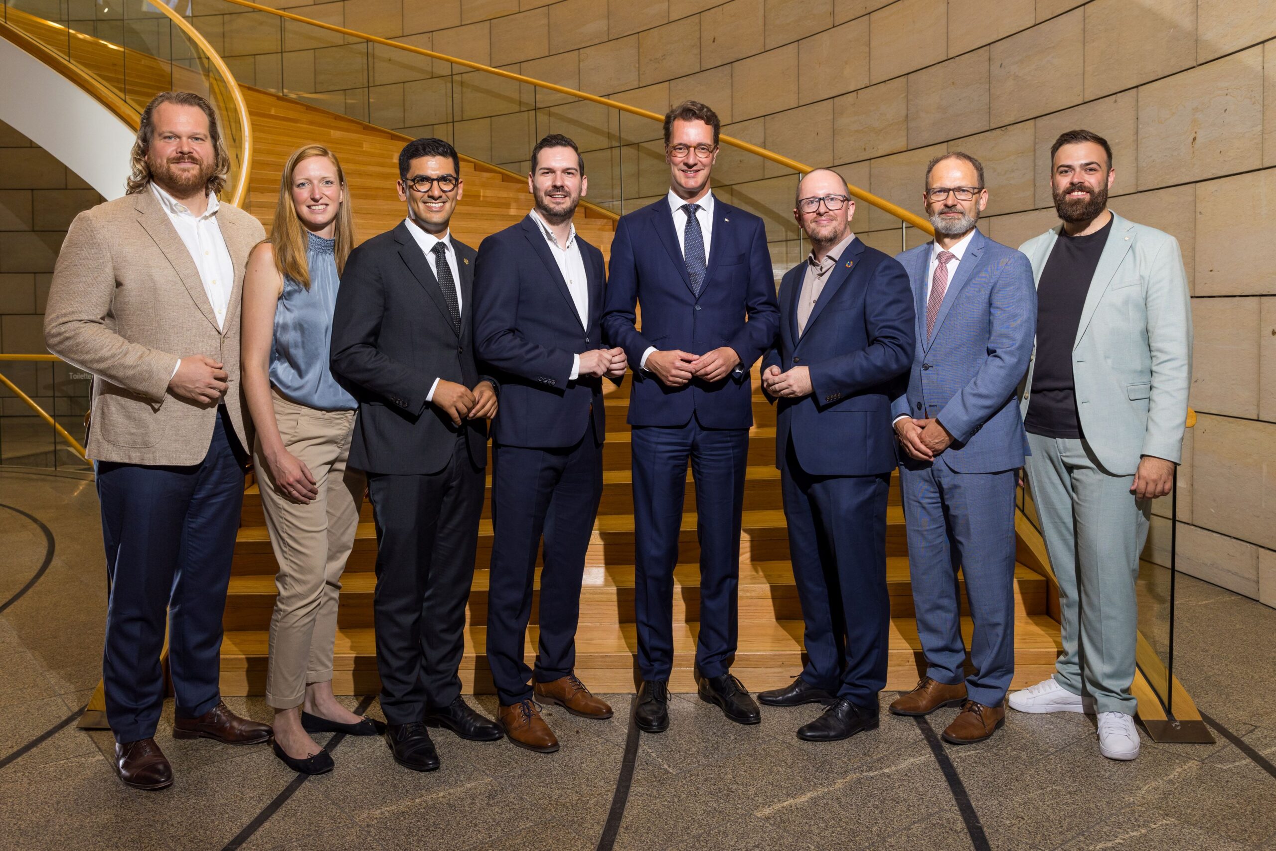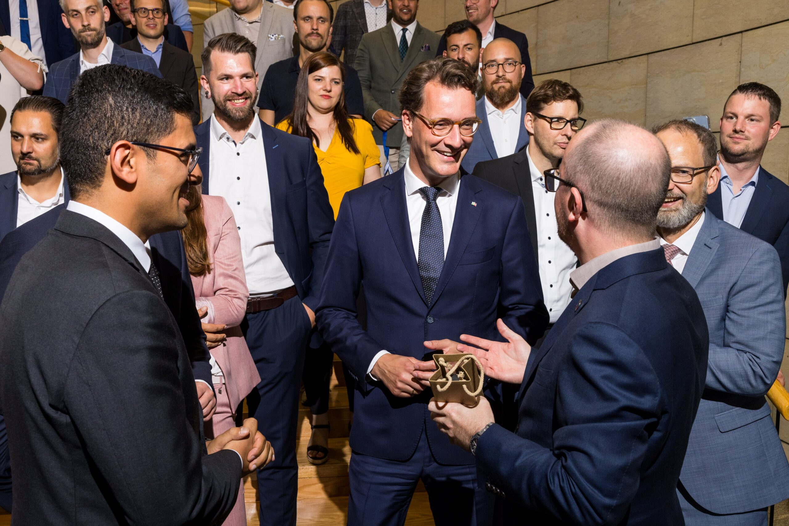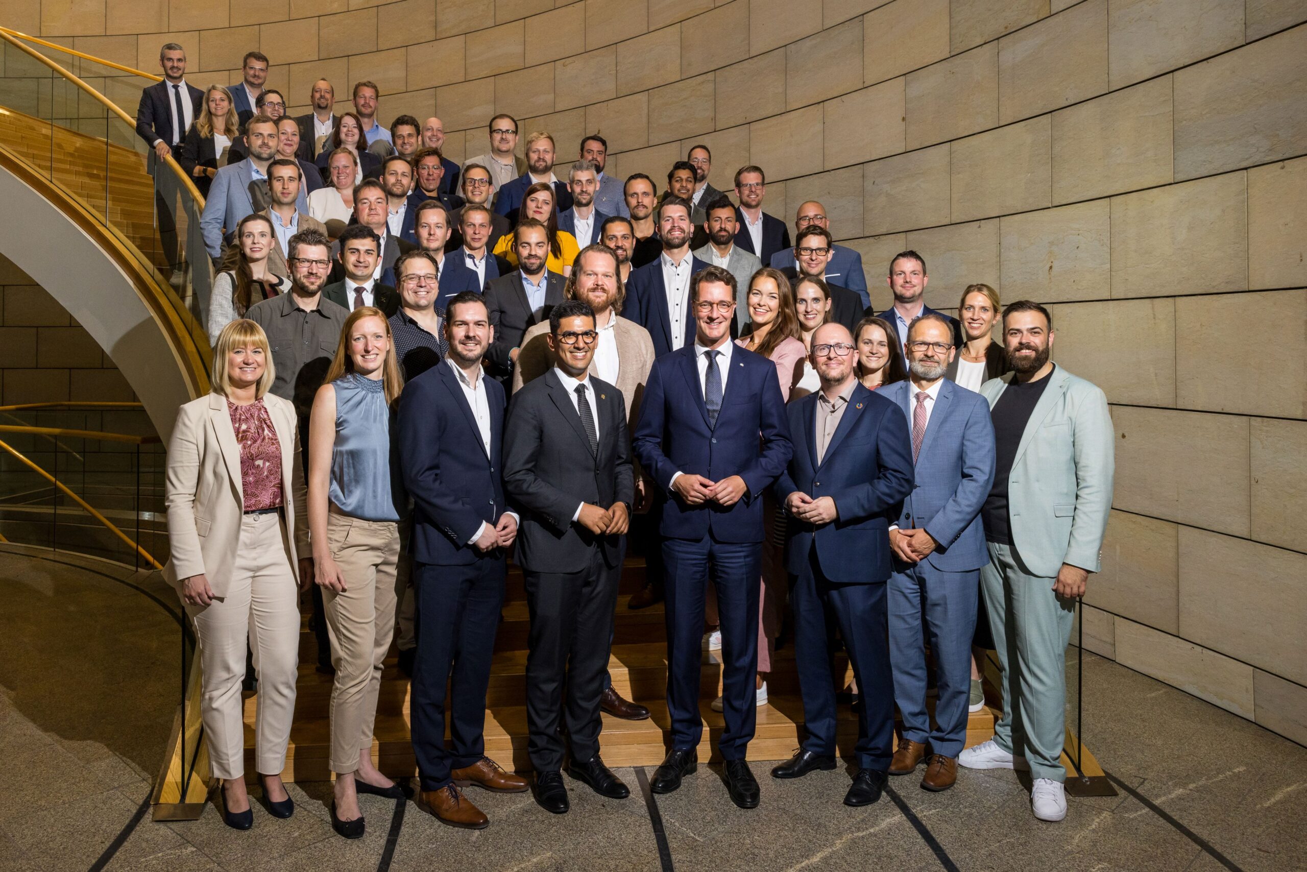 Am zweiten Projekttag hatten alle Teilnehmerinnen und Teilnehmer nochmals die Möglichkeit zur Wahrnehmung individueller Termine mit „ihren“ Abgeordneten und konnten die erste Plenarsitzung nach der Sommerpause von der Besuchertribüne aus verfolgen. Ein ganz besonderes Highlight folgte in diesem Jahr zum Ende des zweiten Projekttages: NRW-Ministerpräsident Hendrik Wüst nahm sich ebenfalls Zeit für den Empfang der jungen Unternehmer/innen und Führungskräfte und verabschiedete die Teilnehmer/innen nach einem gemeinsamen Foto.