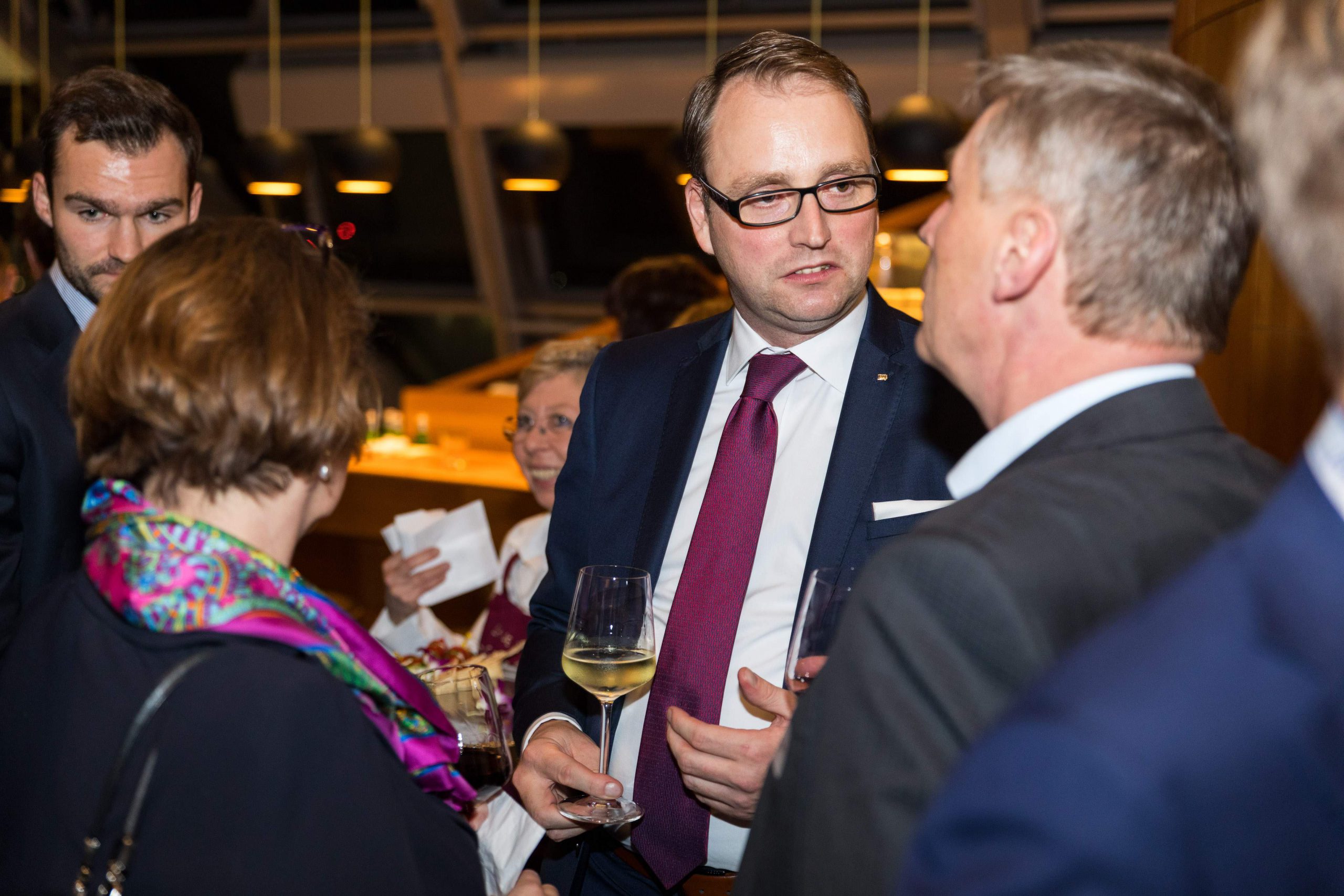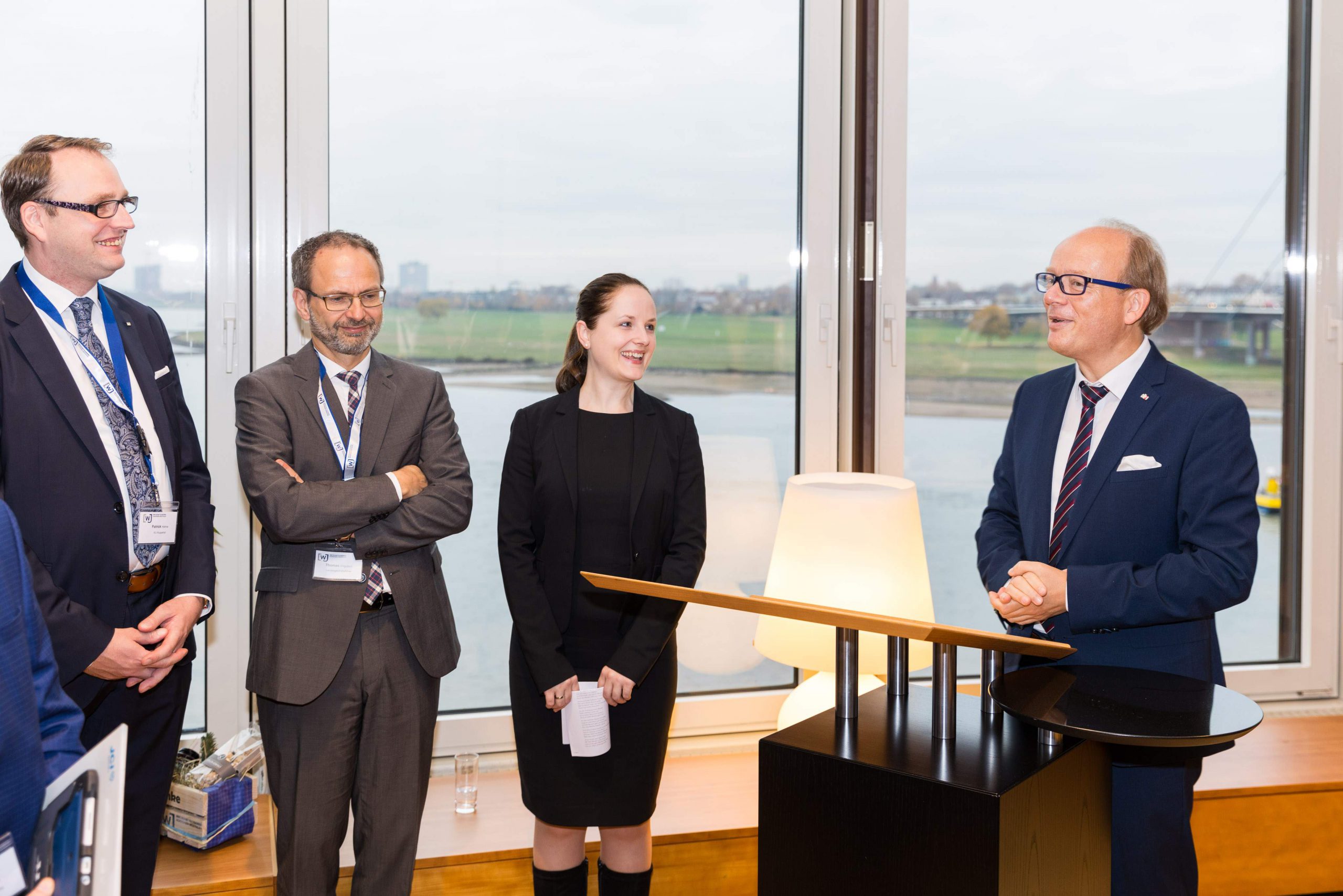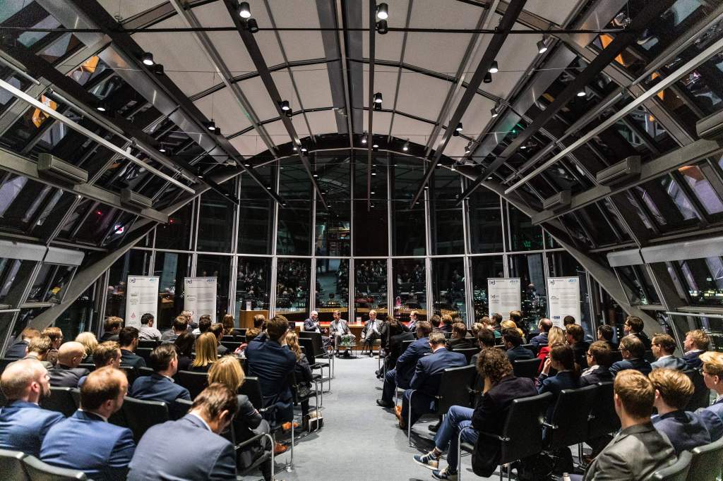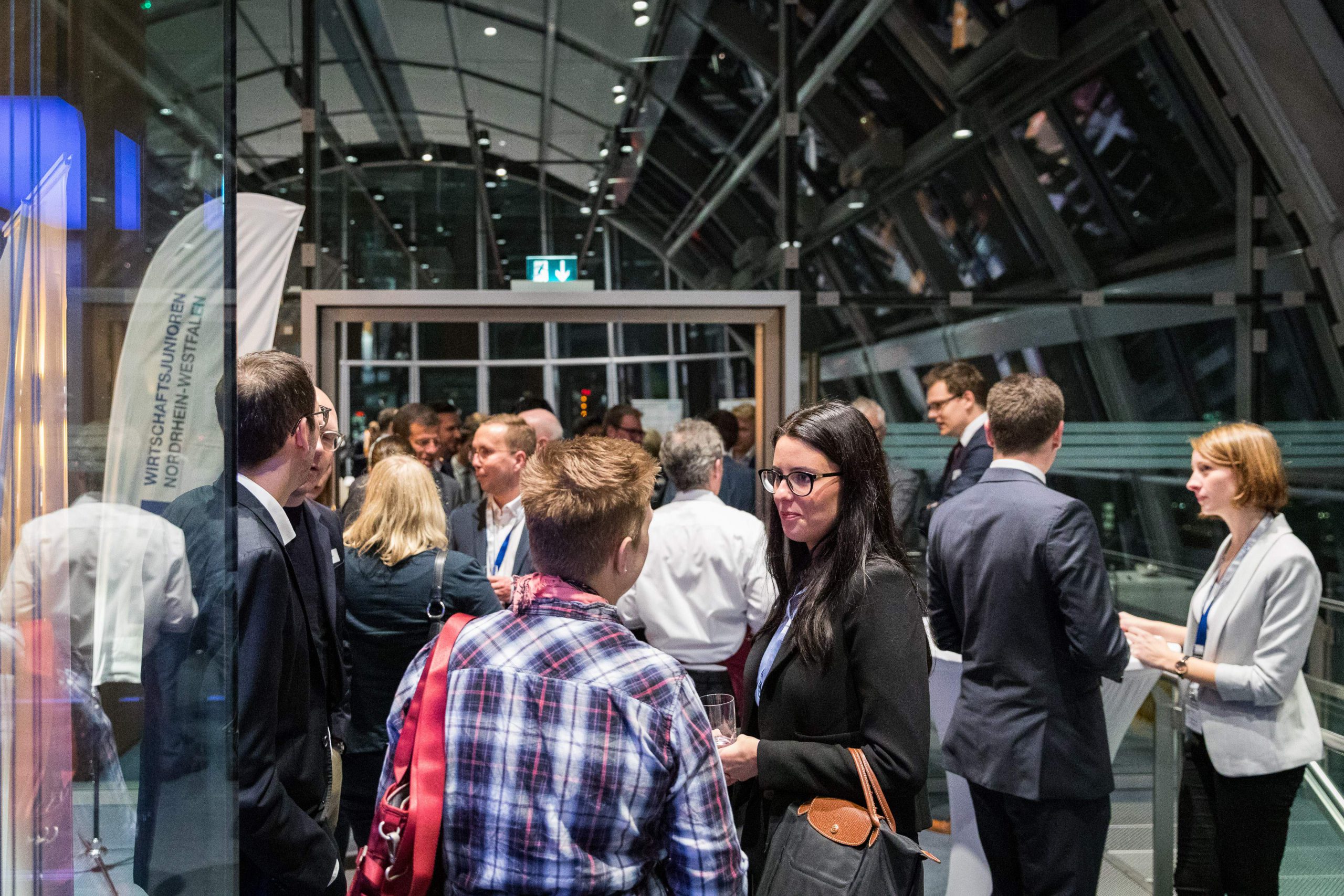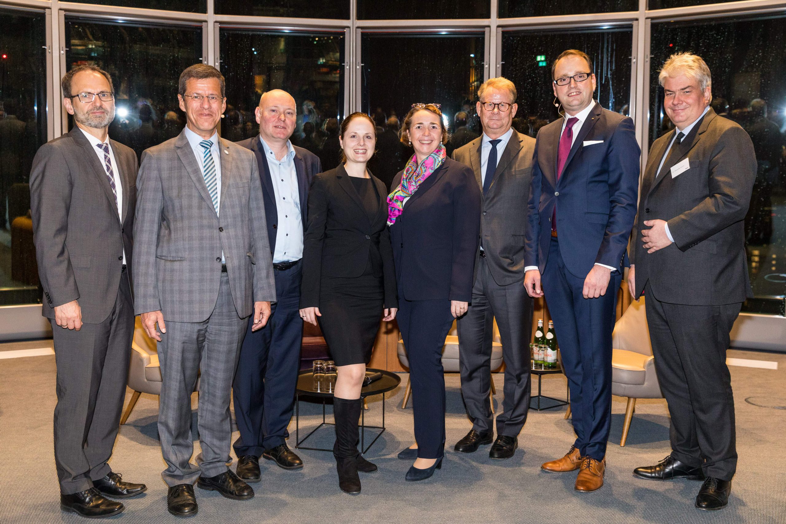 Am Abend bot das „Skydeck“ der Kanzlei Noerr in der 19. Etage des „Sign!“, das mit 74 Metern höchste Gebäude im Düsseldorfer Medienhafen, erneut eine spektakuläre Kulisse für eine Podiumsdiskussion  im Rahmen des 2. Parlamentarischen Abends der Wirtschaftsjunioren NRW. Hierzu waren alle Landtagsabgeordneten sowie Wirtschaftsjunioren, unabhängig von einer Teilnahme am Know-How-Transfer, geladen und insgesamt folgten etwa 120 Teilnehmer – ungefähr zur Hälfte aus der Landespolitik – dieser Einladung. Hierzu zählten auch Bodo Löttgen (Fraktionsvorsitzender CDU), Christof Rasche (Fraktionsvorsitzender FDP) sowie Matthias Kerkhoff (Parlamentarischer Geschäftsführer CDU).