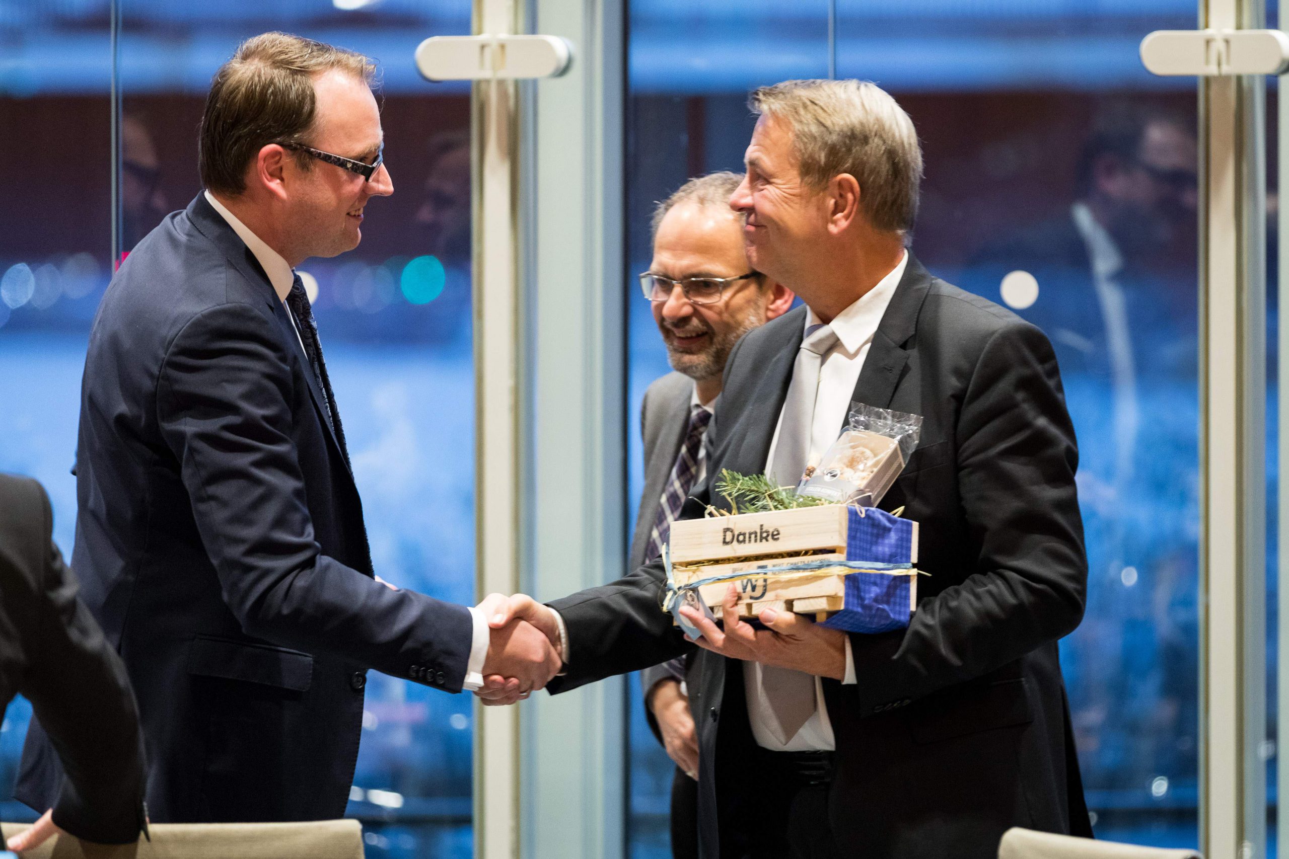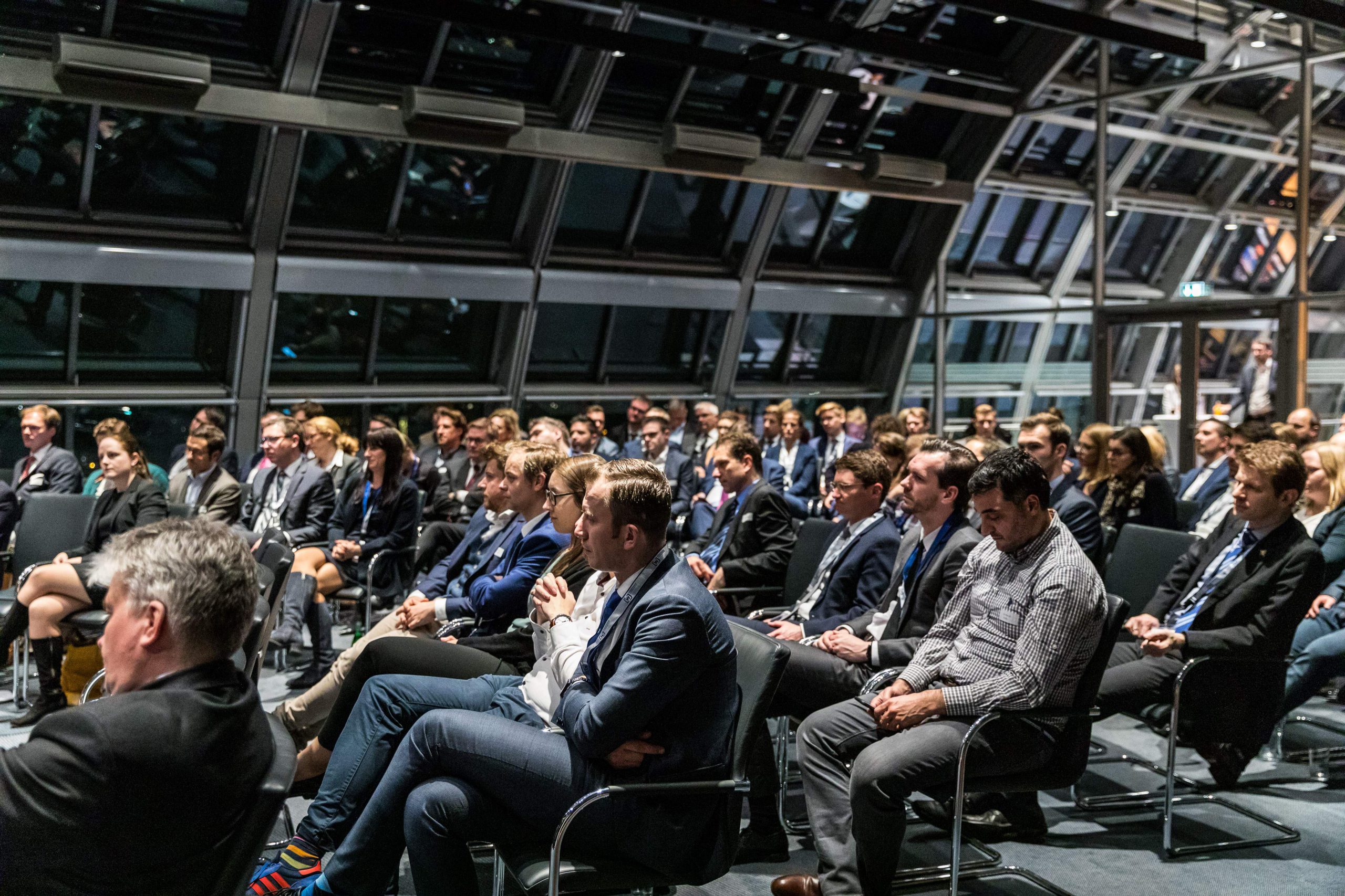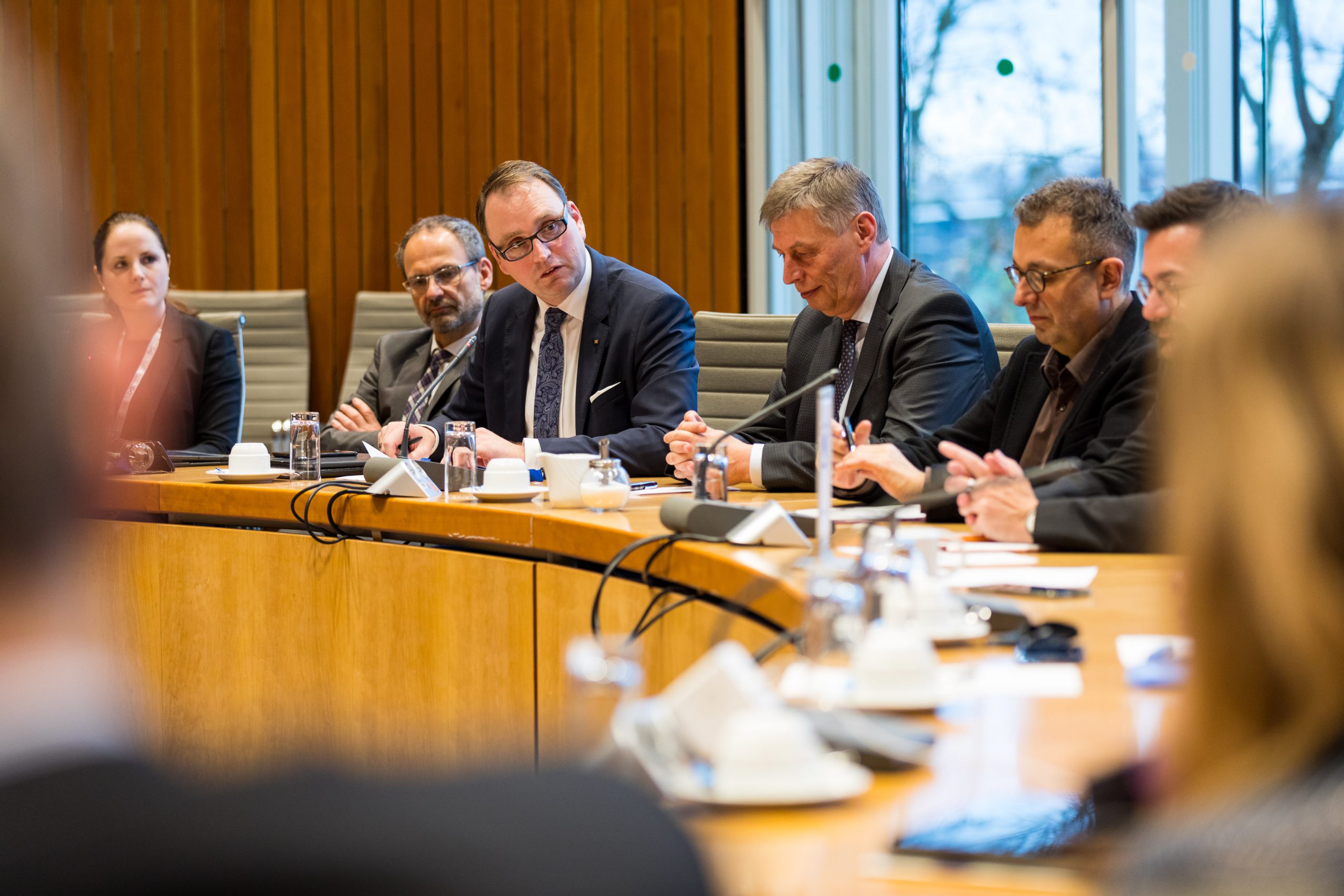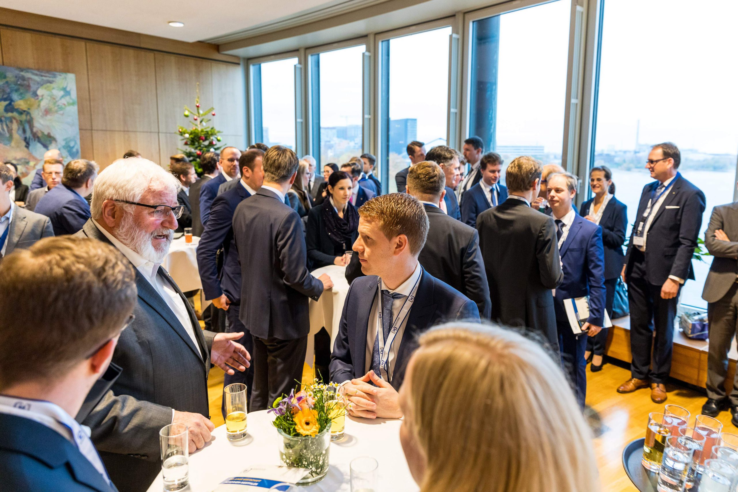 Am Abend bot das „Skydeck“ der Kanzlei Noerr in der 19. Etage des „Sign!“, das mit 74 Metern höchste Gebäude im Düsseldorfer Medienhafen, erneut eine spektakuläre Kulisse für eine Podiumsdiskussion  im Rahmen des 2. Parlamentarischen Abends der Wirtschaftsjunioren NRW. Hierzu waren alle Landtagsabgeordneten sowie Wirtschaftsjunioren, unabhängig von einer Teilnahme am Know-How-Transfer, geladen und insgesamt folgten etwa 120 Teilnehmer – ungefähr zur Hälfte aus der Landespolitik – dieser Einladung. Hierzu zählten auch Bodo Löttgen (Fraktionsvorsitzender CDU), Christof Rasche (Fraktionsvorsitzender FDP) sowie Matthias Kerkhoff (Parlamentarischer Geschäftsführer CDU).