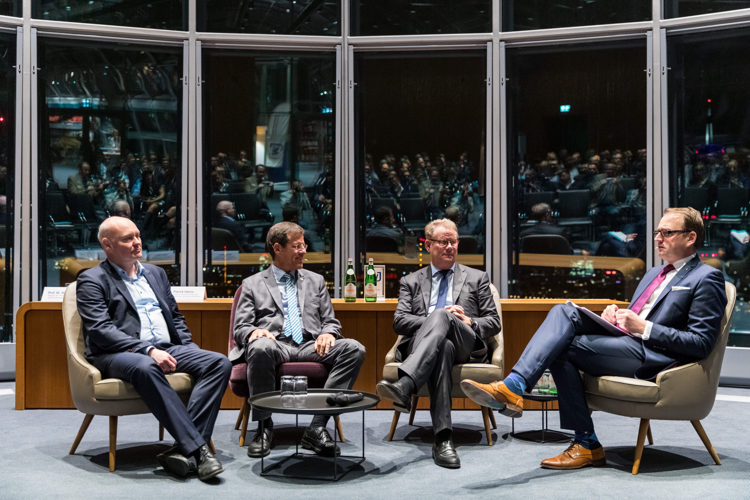 Nach einem Grußwort durch die Landtagsvizepräsidentin Angela Freimuth diskutierte Patrick Hahne gemeinsam mit den Gästen Prof. Dr. Achim Truger (Mitglied des Sachverständigenrats der Bundesregierung), Andreas Schmitz (Vizepräsident der IHK NRW) sowie Eckhard Forst (Vorstandsvorsitzender der NRW.BANK) über das Thema:
