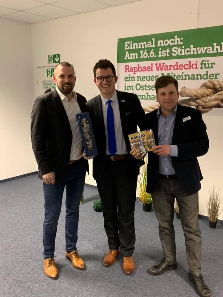 Im Februar hatten die beiden Landesvorstandsmitglieder Patrick Hahne, Ressort „Politik & Wirtschaft“, sowie Vincent Sander, Ressort „Unternehmertum“ die Gelegenheit, vom 28-jährigen lippischen Wirtschaftsjunior Raphael Wardecki spannende Einblicke in seinen Wahlkampf rund um die Bürgermeisterwahl im Ostseebad Boltenhagen sowie seine Arbeit als gewählter, grüner Bürgermeister zu erhalten.