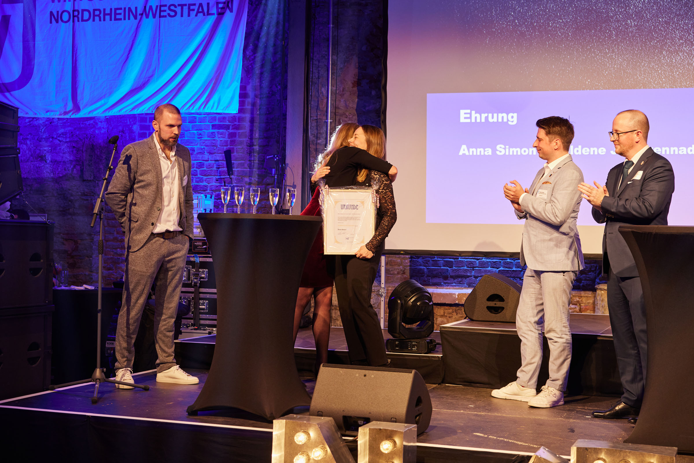 Ein besonderes Highlight an diesem Abend folgte mit zwei besonderen Auszeichnungen: Die Wirtschaftsjunioren Düsseldorf erreichten für ihr herausragendes, ehrenamtliches Engagement sowohl auf Kreis- als auch auf Landesebene den ersten Platz im Landeswettbewerb „Aktivster Kreis NRW 2022“ und durften sich über ein Preisgeld in Höhe von 500 Euro freuen. Mit emotionalen Videobotschaften sowie einer anerkennenden Laudatio überreichte der amtierende Bundesvorsitzende Tobias Hocke mit der goldenen Juniorennadel der Wirtschaftsjunioren Deutschland eine ganz besondere Ehrung an Anna Maria Simon für ihr langjähriges und beispielloses Engagement für die Wirtschaftsjunioren sowohl national als auch international.