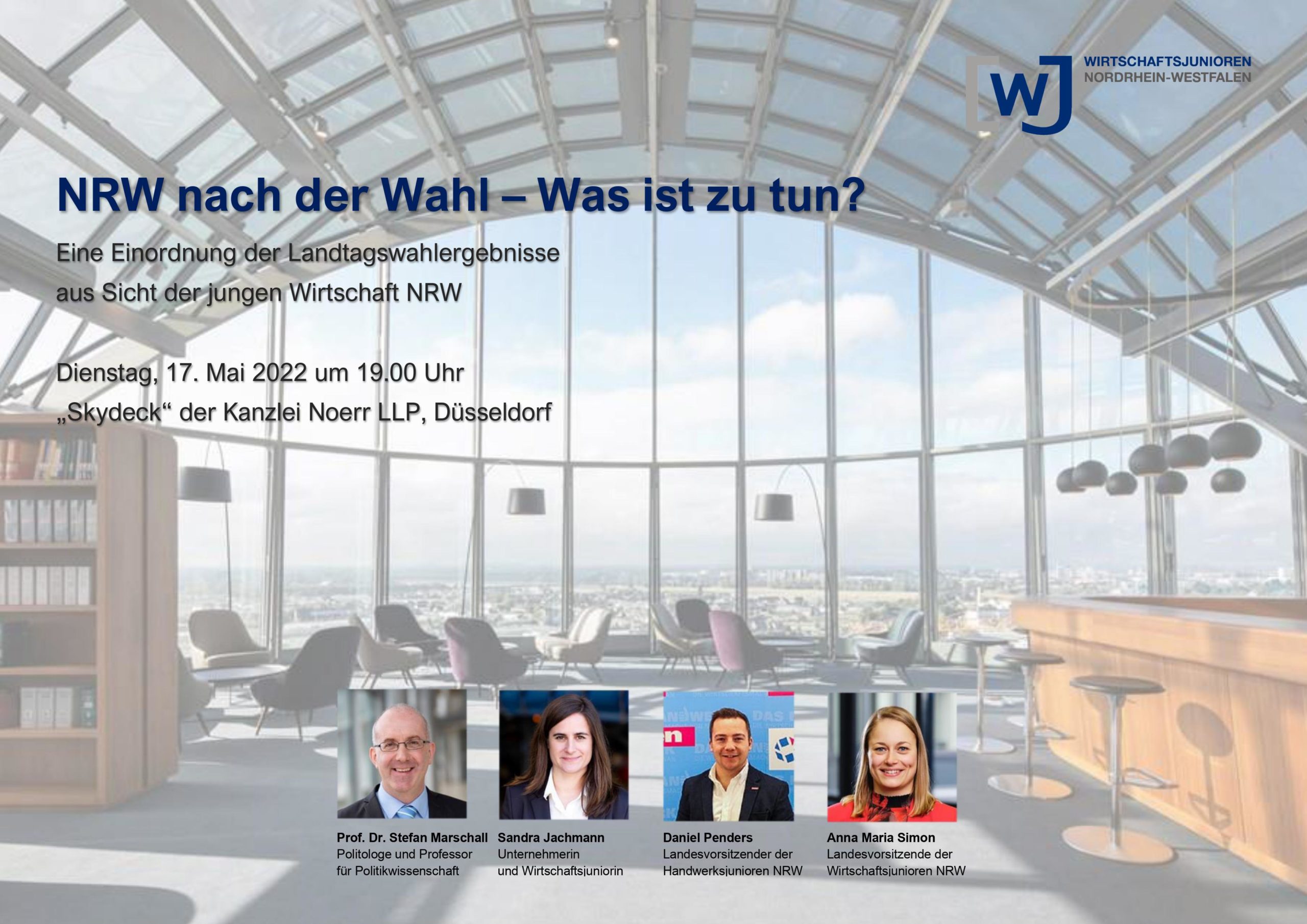 Seit 2018 gehört "Parlamentarische Abend" über den Dächern des Düsseldorfer Medienhafens zum festen Bestandteil des vielfältigen Rahmenprogramms des Know-How-Transfers, dem zweitägigen Austausch zwischen junger Wirtschaft und landespolitischen Entscheidungsträger:innen. Nach einer spannenden Diskussionsrunde mit hochkarätigen Gästen aus Politik und Wirtschaft bietet das anschließende Get-together zudem ideale Voraussetzungen für einen lockeren Austausch in ungezwungener, aber eindrucksvoller Atmosphäre.