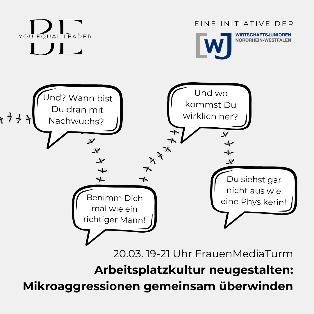 Event: Arbeitsplatzkultur neu gestalten - Mikroaggressionen gemeinsam überwinden. Mikroaggressionen sind subtile Formen der Diskriminierung, die oft unbemerkt bleiben, aber dennoch tiefgreifende Auswirkungen auf unser tägliches Miteinander haben können. Lerne beim ersten Roadshow-Event der "Be YOU. Be EQUAL. Be LEADER."-Initiative, wie Du Deine Arbeitsplatzkultur positiv beeinflusst, um mit zufriedenen Mitarbeitenden in einem entspannten Arbeitsumfeld optimierte Prozesse zu gestalten.
