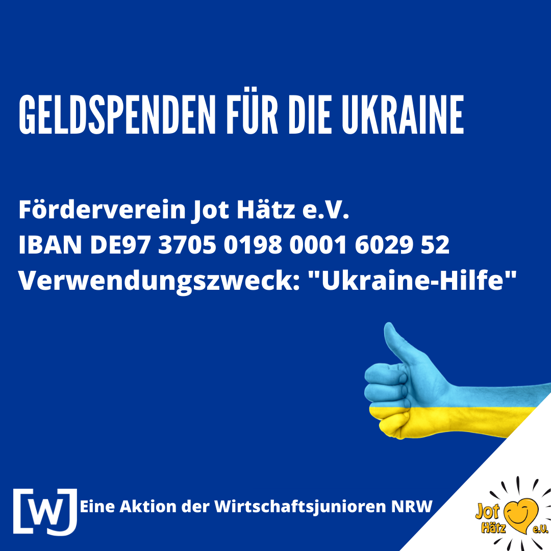 Wir sind zutiefst betroffen vom Krieg in der Ukraine. Viele Hilfsangebote in Form von Sachspenden wurden bereits organisiert. Was wir unter anderem zum jetzigen Zeitpunkt tun können, ist Geldspenden zu sammeln. Wir freuen uns daher sehr, dass die Wirtschaftsjunioren Köln ihren Förderverein "Jot Hätz" zur Verfügung stellen und darüber alle Geldspenden bündeln und an anerkannte Hilfsorganisationen weiterleiten.