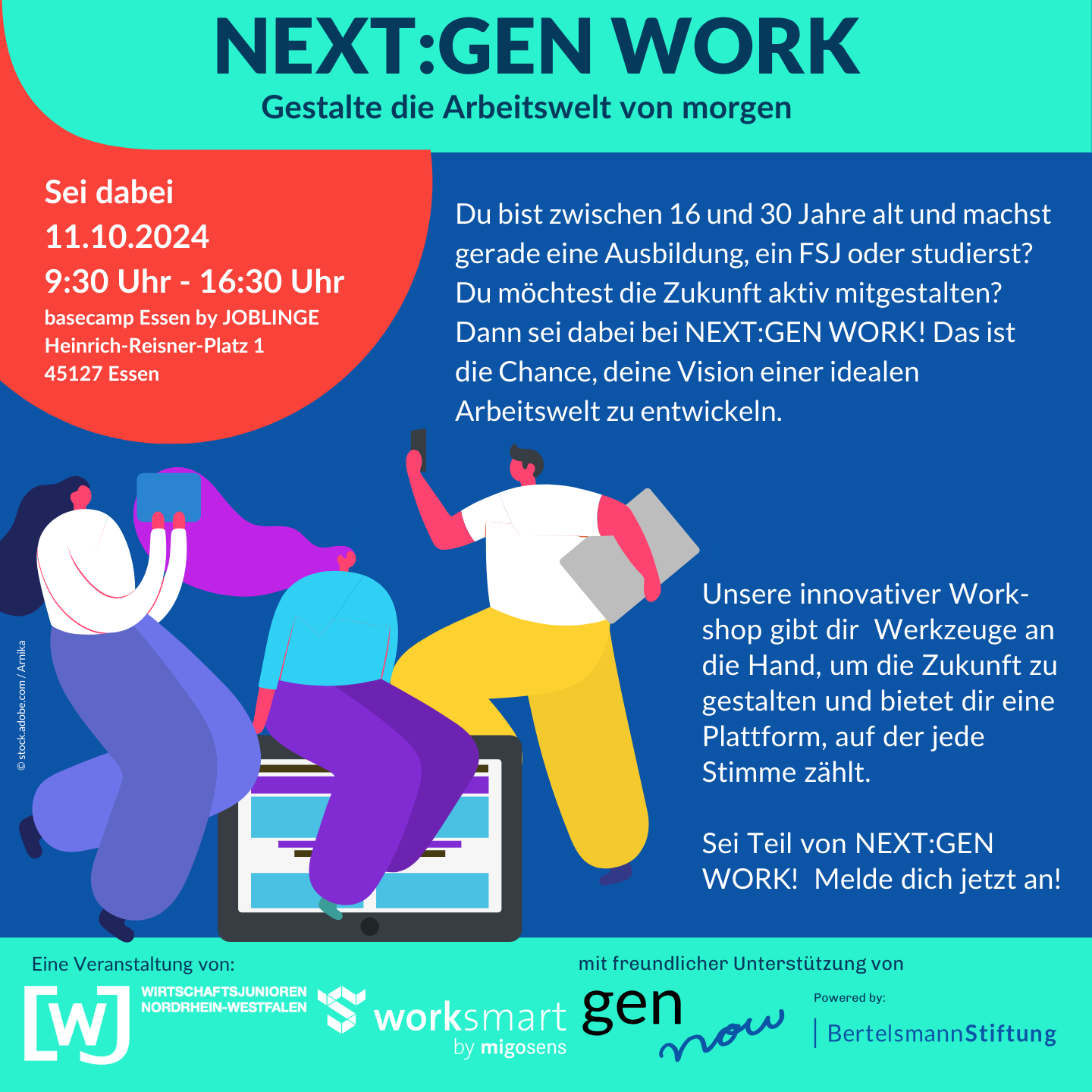Am 11. Oktober 2024 wurde das Basecamp Essen zum Innovationslabor der Zukunft: Bei der Veranstaltung NEXT:GEN WORK hatten junge Menschen in Ausbildung die Gelegenheit, ihre Perspektiven und Ideen für die Arbeitswelt von morgen einzubringen. Organisiert vom Ressort Bildung & Wirtschaft der Wirtschaftsjunioren NRW und unterstützt durch die Initiative GenNow powered by Bertelsmann Stiftung sowie Worksmart by Migosens, vereinte die Veranstaltung zukunftsweisende Impulse, kreative Workshops und den generationenübergreifenden Austausch.